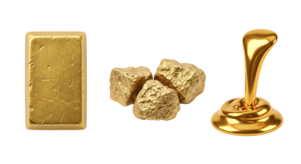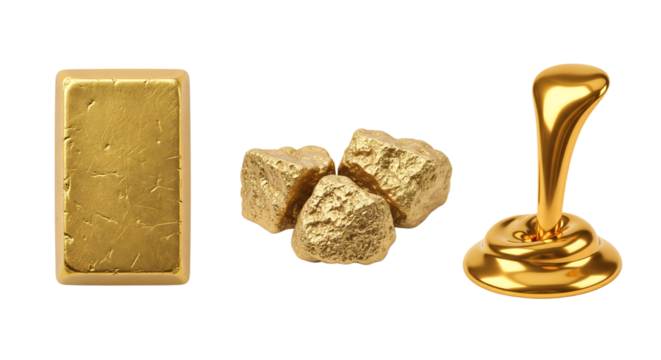 Golden gold bar, nuggets, and molten, isolated on transparent background
