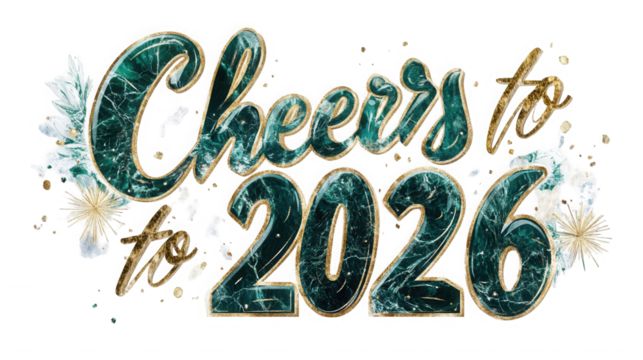 Cheers to 2026 text with a green marble texture and gold outline on a black background with flowers on transparent background