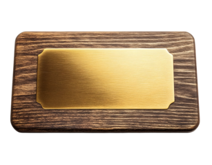 Wooden board with gold plate isolated on white background. plaque with gold overlay for text