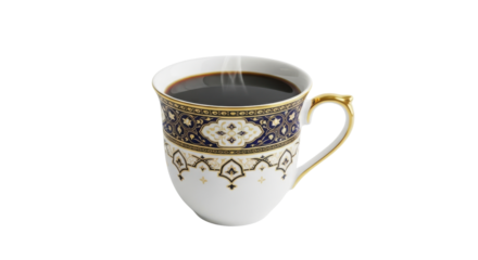 White porcelain cup with ornate blue and gold pattern filled with dark coffee image, Isolated On Png Transparent Background