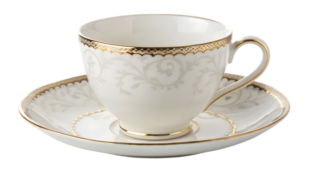 White porcelain coffee cup and saucer with gold pattern isolated on white