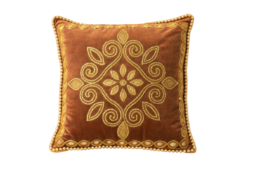 PNG Ornate embroidered cushion with intricate gold patterns on velvet fabric