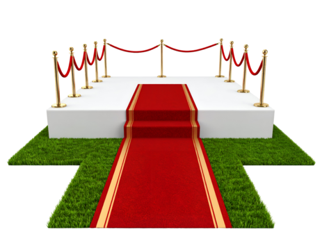 Red carpet entrance with ropes and golden posts on green grass