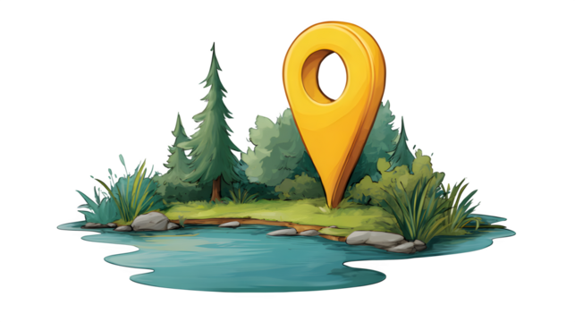 A stylized map pin, marking a lake location, isolated on Transparent Background