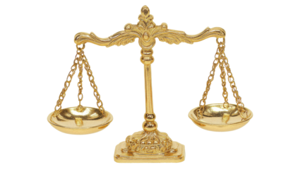 Elegant gold scales of justice representing law, balance and fairness in legal matters, transparent
