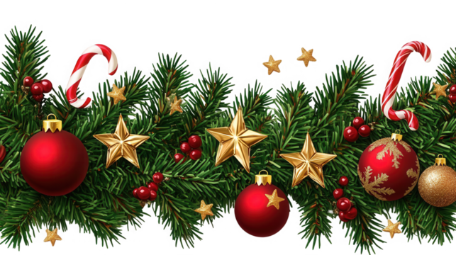 Festive christmas garland border with red ornaments gold stars candy canes and pine branches on transparent background