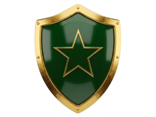 Green shield with gold star and border on transparent background