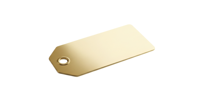 Gold tag is isolated against a background, reflecting subtle ambient light across its shiny surface.