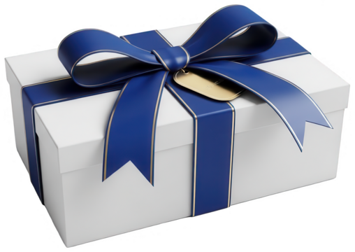 White gift box with blue satin ribbon and gold tag isolated on transparent background