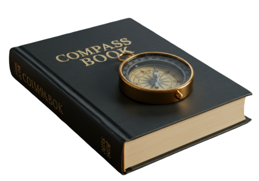 Isolated Compass atop an old Navigation Book, antique gold tool of direction finding adventure