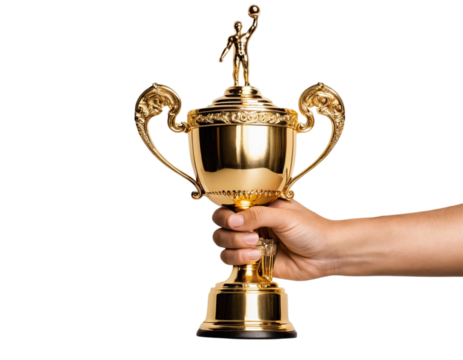Successful athlete triumphantly holding winning trophy transparent background