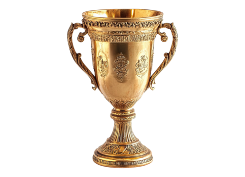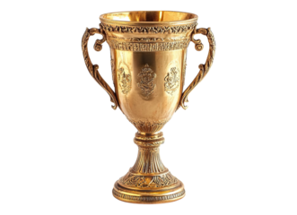 Ornate gold trophy cup representing victory, achievement, and success, isolated on transparent background