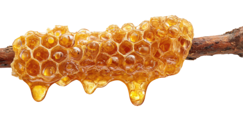 Close-up of a honeycomb dripping golden liquid, attached to a brown branch against a black backdrop
