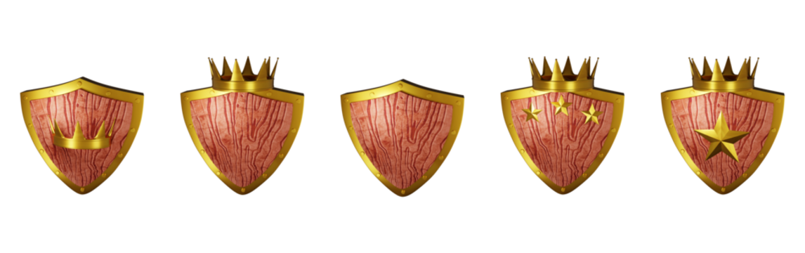 3D viking wooden shield, medieval game UI victory badge set, royal golden crown vintage knight armor. Defence realistic fantasy assets, warrior fight level up reward, timber frame. RPG wooden shield