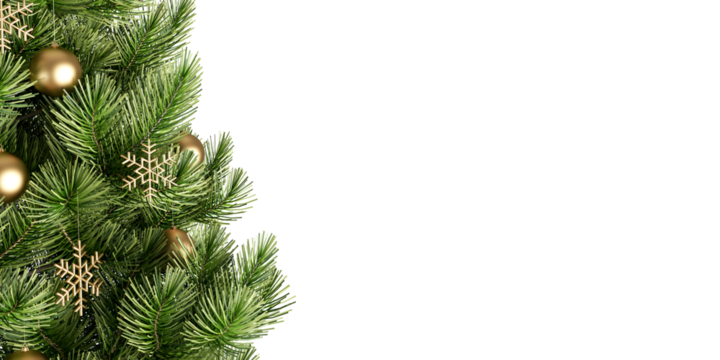 christmas tree branches with golden balls isolated on white