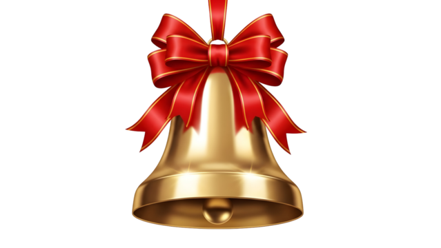 Golden holiday bells with elegant red bow on transparent background