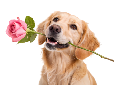 Golden Retriever Holding a Pink Rose on transparent background
