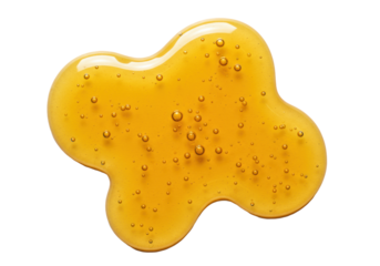 Viscous, transparent golden liquid with air bubbles in an organic puddle, artfully presented on a transparent background with copy space. Concept for food or cosmetic product