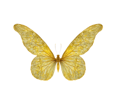 A realistic yellow butterfly with delicate wings, intricate vein patterns, and a soft gradient of golden hues. Transparent background