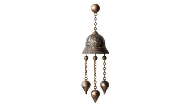 Ornate bronze bell with intricate carvings hangs suspended by delicate chains against a stark black backdrop creating a vintage aesthetic charm