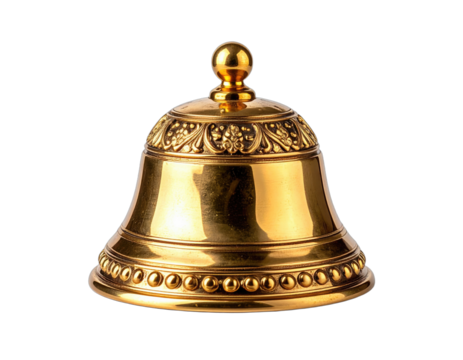 Close-up of a polished, golden bell, ornate with floral relief, isolated on black