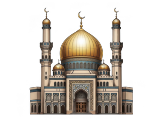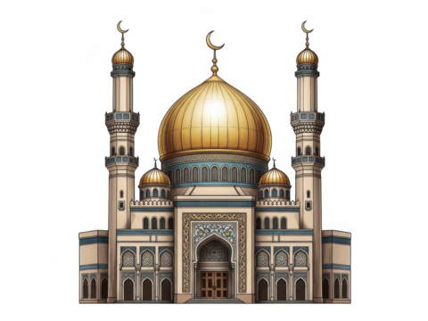Illustrated mosque with golden dome and minarets isolated on transparent background