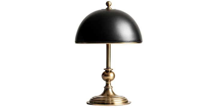 A close-up studio shot of a desk lamp with a black dome shade and golden stand