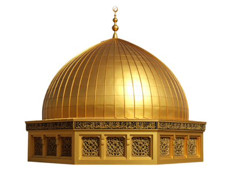 A golden mosque dome with intricate patterns, representing Islamic architecture, isolated on white.