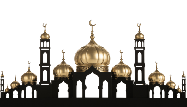 Islamic mosque silhouette with towers and arches on transparent background