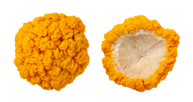 fresh golden ear mushroom or tremella mesenterica (yellow brain fungus) isolated on white background.