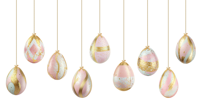 Pastel color golden speckled painted Easter eggs hanging on golden strings isolated cutout on transparent