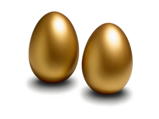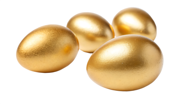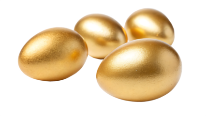 Shiny, golden eggs resting delicately on a transparent background. The egg has a smooth, reflective surface with subtle light reflections and a warm, golden hue