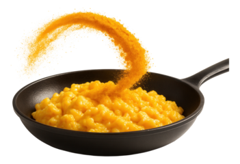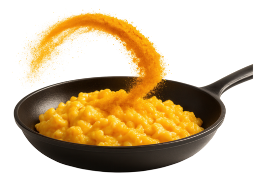 Turmeric powder dispersing above a metal pan of scrambled eggs, infusing a golden hue.