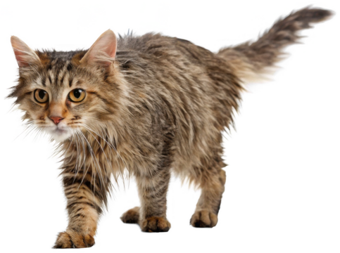 Adorable young tabby kitten with long, fluffy fur and captivating golden eyes is playfully walking forward with a slightly arched back and raised tail, bathed in, isolated on transparent background.