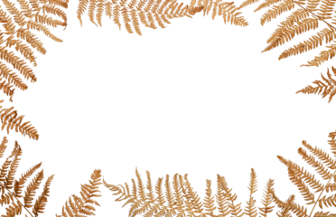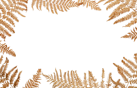 Golden fern leaves frame on transparent background, autumn nature border, isolated composition for seasonal greeting card, fall wedding invitation, botanical template, clipping path included