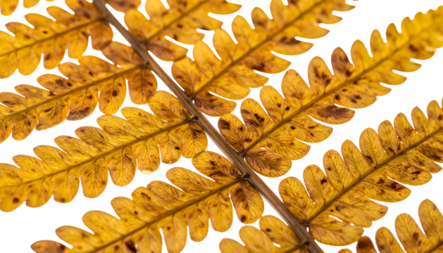 Close-up of a decaying fern frond with golden hues and intricate details