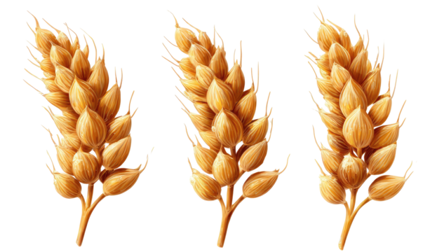 Three stylized, golden wheat stalks, showing detail on a transparent black background