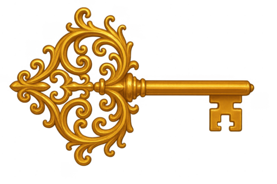Golden vintage ornate key unlocking success and solution