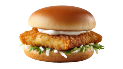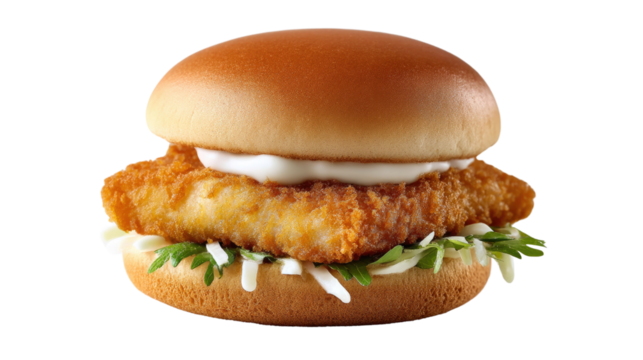 Crispy fish burger: A mouthwatering close-up showcases a perfectly crafted fish burger, with a golden, crispy fillet nestled between fresh, soft buns. A drizzle of creamy sauce and crisp.