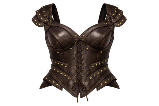 Dark brown leather fantasy armor corset for strong female warrior, featuring golden studs and front lacing, transparent background