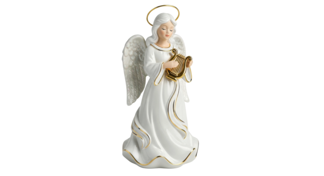 Elegant golden harp standing against white background, detailed ornate carvings and strings