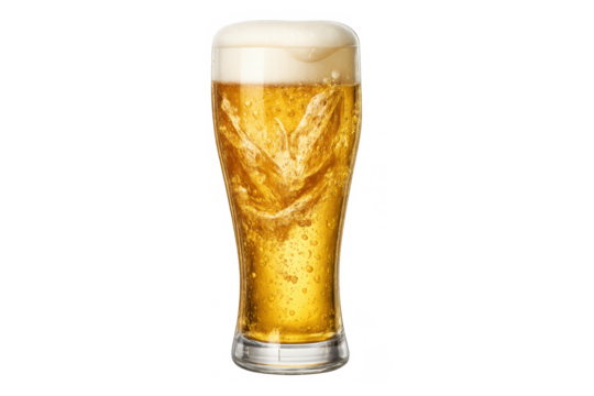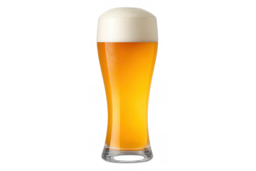 Fresh golden beer glass with thick white foam, serving a refreshing alcoholic pilsner drink. Transparent background