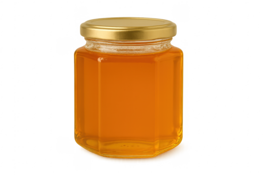 Honeycomb filled with golden honey in a glass jar on transparent background