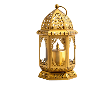 Traditional golden lantern with ornate engravings dangling from a chain on transparent png background. Ai generated
