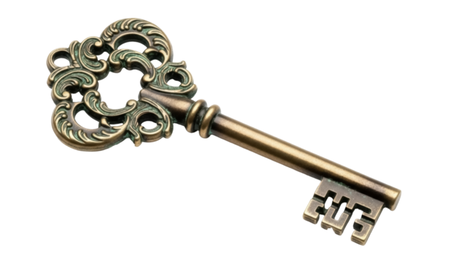 Ornate antique key PNG isolated on transparent background, vintage style golden key for design elements and security concepts
