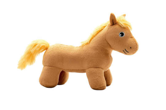 A charming plush horse toy with a golden mane standing proudly against a bright backdrop isolated on transparent background