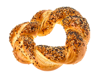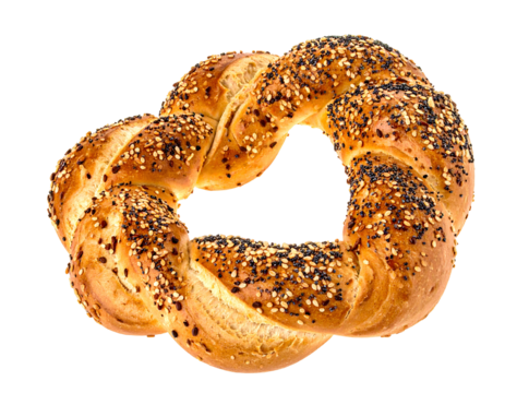 Twisted bread ring with sesame and poppy seeds on a black background