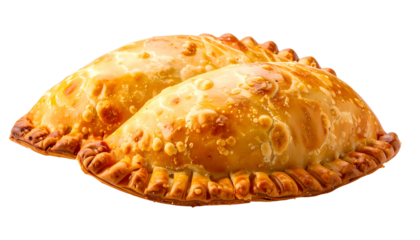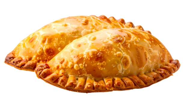 Two golden-brown, baked pastries with crimped edges, on a transparent background