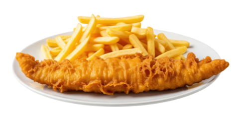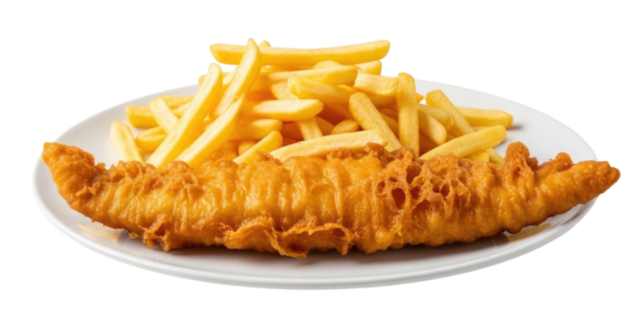 Crispy battered fish fillet served with golden fries on a white plate, transparent background, cutout PNG