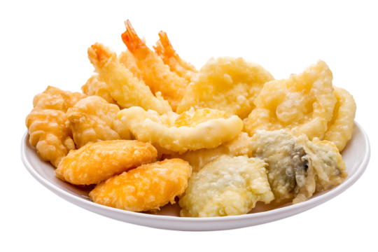 golden tempura platter on white plate isolated on white background